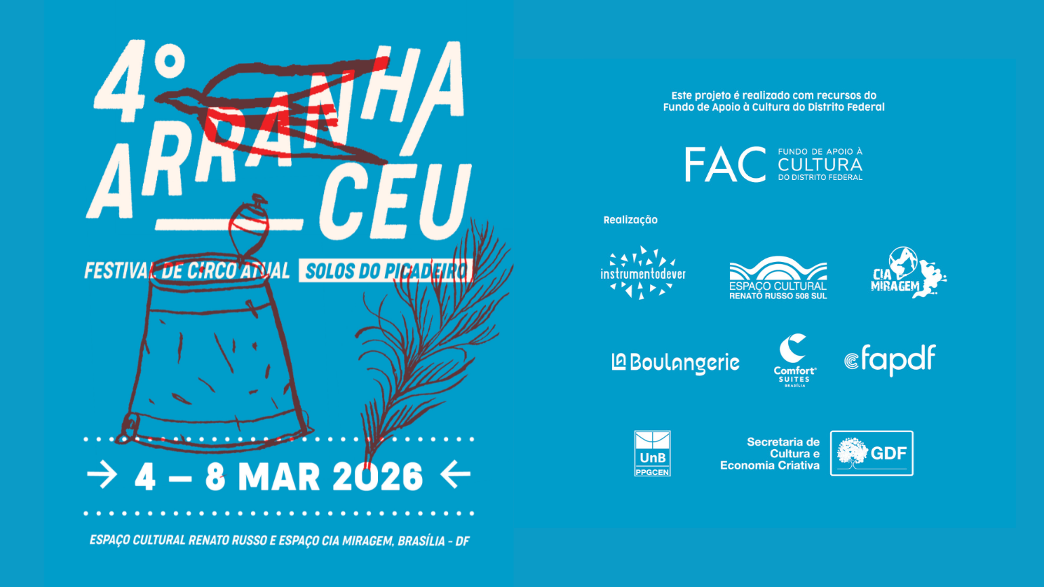 A 4ª edição do ARRANHA-CÉU - Festival de Circo Atual vem mais enxuta, mais íntima e criando um espaço de proximidade com o público. Na edição passada, perguntamos “qual é o lugar do circo?” e ocupamos diferentes espaços físicos e virtuais de Brasília. Hoje, afirmamos que o lugar do circo é, antes de tudo, no corpo. Do artista e do público. É onde tudo começa e por onde o mundo se constrói.
