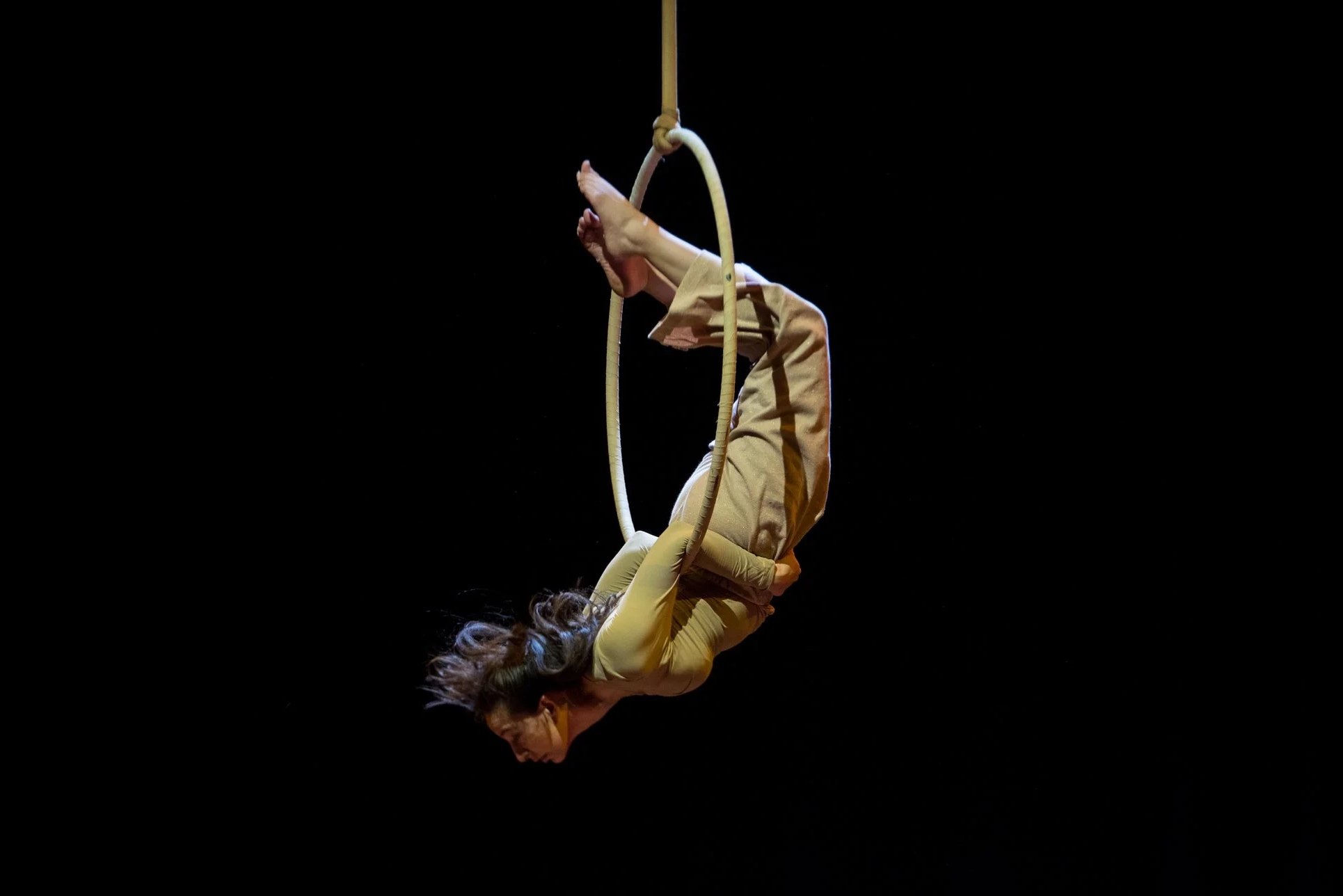 Inspirado no poema Saturno, de Renata Canin, o número é uma travessia poética pelas correntes invisíveis das emoções humanas. Como rios que se encontram, se misturam e seguem novos cursos, a cena revela o fluxo contínuo de sentimentos que nos atravessam. Sem início definido, sem fim absoluto, apenas transformação. Suspensa no ar, Ana Coll percorre a lira como quem atravessa paisagens internas, o aparelho com extensão das suas memórias e dos seu corpo. Cada movimento nasce do anterior: a delicadeza se dissolve em tensão, a queda encontra o equilíbrio, a entrega se transforma em força. Em imagens de linguagem cinematográfica, o corpo desenha no espaço a passagem entre estados emocionais, do recolhimento à expansão, da fragilidade ao impulso, da vertigem ao silêncio.