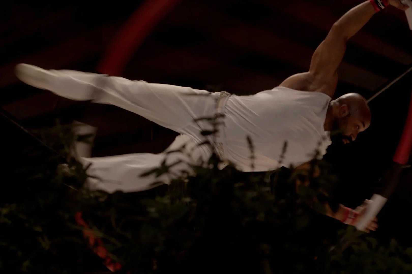 Em Cobra Coral, a roda Cyr gira como um círculo de força, proteção e ancestralidade. O corpo do artista e Mestre de Capoeira, Jovani Almeida, também conhecido como Tukano, serpenteia dentro e fora do eixo, em movimentos que evocam a ginga da capoeira, o jogo de presença e escuta, o equilíbrio entre ataque e defesa, terra e ar. A rotação contínua da roda se transforma em rito. Cada impulso carrega a vibração de saberes antigos, conectando o movimento às matrizes culturais brasileiras de origem africana. Na fluidez entre giros, quedas e retomadas, surgem referências simbólicas às energias da natureza, à proteção espiritual e à força dos ancestrais nesse diálogo entre o visível e o invisível.